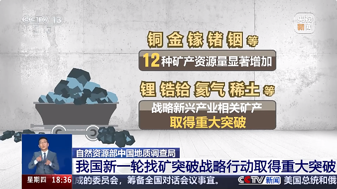中國工程院院士唐菊興介紹,新一輪找礦突破行動,36個礦種采取一礦一策。既有石油、天然氣、煤炭、鐵、錳等大宗礦產(chǎn),也有鋰、稀土等戰(zhàn)略新興礦產(chǎn)。